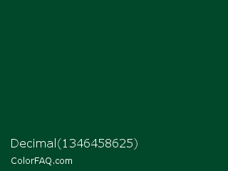 Decimal 1346458625 Color is a very dark green color and the nearest color is British Racing Green #004225. Hex code #014729 and RGB value is rgb(1,71,41). In RGB color space, this color is composed of 0% red, 28% green, 16% blue, In CMYK color space, this color is composed of 99% cyan, 0% magenta, 42% yellow , 72% black , In HSL color space, this color has a hue angle of 154° , 97% saturation and 14% lightness.