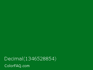 Decimal 1346528854 Color is a dark green color and the nearest color is La Salle Green #087830. Hex code #017320 and RGB value is rgb(1,115,32). In RGB color space, this color is composed of 0% red, 45% green, 13% blue, In CMYK color space, this color is composed of 99% cyan, 0% magenta, 72% yellow , 55% black , In HSL color space, this color has a hue angle of 136° , 98% saturation and 23% lightness.