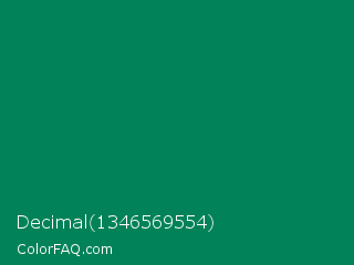 Decimal 1346569554 Color is a dark green color and the nearest color is Spanish Viridian #007f5c. Hex code #018258 and RGB value is rgb(1,130,88). In RGB color space, this color is composed of 0% red, 51% green, 35% blue, In CMYK color space, this color is composed of 99% cyan, 0% magenta, 32% yellow , 49% black , In HSL color space, this color has a hue angle of 160° , 98% saturation and 26% lightness.