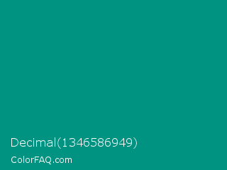 Decimal 1346586949 Color is a dark cyan color and the nearest color is Paolo Veronese Green #009b7d. Hex code #019381 and RGB value is rgb(1,147,129). In RGB color space, this color is composed of 0% red, 58% green, 51% blue, In CMYK color space, this color is composed of 99% cyan, 0% magenta, 12% yellow , 42% black , In HSL color space, this color has a hue angle of 173° , 99% saturation and 29% lightness.