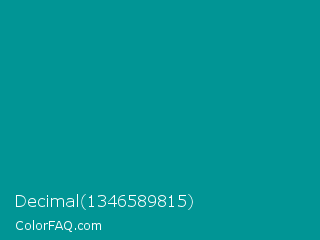 Decimal 1346589815 Color is a dark cyan color and the nearest color is Viridian Green #009698. Hex code #019595 and RGB value is rgb(1,149,149). In RGB color space, this color is composed of 0% red, 58% green, 58% blue, In CMYK color space, this color is composed of 99% cyan, 0% magenta, 0% yellow , 42% black , In HSL color space, this color has a hue angle of 180° , 99% saturation and 29% lightness.
