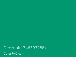 Decimal 1346593288 Color is a dark cyan color and the nearest color is Green NCS #009f6b. Hex code #019870 and RGB value is rgb(1,152,112). In RGB color space, this color is composed of 0% red, 60% green, 44% blue, In CMYK color space, this color is composed of 99% cyan, 0% magenta, 26% yellow , 40% black , In HSL color space, this color has a hue angle of 164° , 99% saturation and 30% lightness.