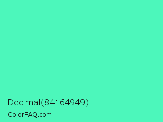 Decimal 84164949 Color is a light green color and the nearest color is Turquoise #40e0d0. Hex code #4cf7bb and RGB value is rgb(76,247,187). In RGB color space, this color is composed of 30% red, 97% green, 73% blue, In CMYK color space, this color is composed of 69% cyan, 0% magenta, 24% yellow , 3% black , In HSL color space, this color has a hue angle of 159° , 91% saturation and 63% lightness.