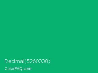Decimal 5260338 Color is a normal green color and the nearest color is Jade #00a86b. Hex code #07b270 and RGB value is rgb(7,178,112). In RGB color space, this color is composed of 3% red, 70% green, 44% blue, In CMYK color space, this color is composed of 96% cyan, 0% magenta, 37% yellow , 30% black , In HSL color space, this color has a hue angle of 157° , 92% saturation and 36% lightness.