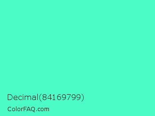 Decimal 84169799 Color is a light green color and the nearest color is Turquoise #40e0d0. Hex code #4cfcc7 and RGB value is rgb(76,252,199). In RGB color space, this color is composed of 30% red, 99% green, 78% blue, In CMYK color space, this color is composed of 70% cyan, 0% magenta, 21% yellow , 1% black , In HSL color space, this color has a hue angle of 162° , 97% saturation and 64% lightness.