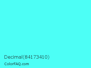 Decimal 84173410 Color is a light cyan color and the nearest color is Electric Blue #7df9ff. Hex code #4cfff6 and RGB value is rgb(76,255,246). In RGB color space, this color is composed of 30% red, 100% green, 96% blue, In CMYK color space, this color is composed of 70% cyan, 0% magenta, 4% yellow , 0% black , In HSL color space, this color has a hue angle of 177° , 100% saturation and 65% lightness.