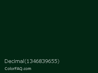 Decimal 1346839655 Color is a almost black green color and the nearest color is English Holly #022d15. Hex code #022613 and RGB value is rgb(2,38,19). In RGB color space, this color is composed of 1% red, 15% green, 7% blue, In CMYK color space, this color is composed of 95% cyan, 0% magenta, 50% yellow , 85% black , In HSL color space, this color has a hue angle of 148° , 90% saturation and 8% lightness.