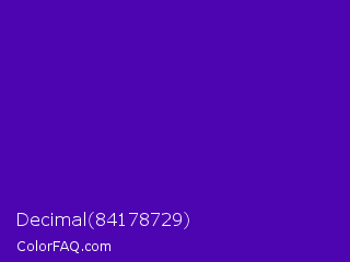 Decimal 84178729 Color is a normal violet color and the nearest color is Purple #660099. Hex code #4d05b1 and RGB value is rgb(77,5,177). In RGB color space, this color is composed of 30% red, 2% green, 69% blue, In CMYK color space, this color is composed of 56% cyan, 97% magenta, 0% yellow , 31% black , In HSL color space, this color has a hue angle of 265° , 95% saturation and 36% lightness.