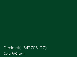 Decimal 1347703177 Color is a very dark green color and the nearest color is British Racing Green #004225. Hex code #034225 and RGB value is rgb(3,66,37). In RGB color space, this color is composed of 1% red, 26% green, 15% blue, In CMYK color space, this color is composed of 95% cyan, 0% magenta, 44% yellow , 74% black , In HSL color space, this color has a hue angle of 152° , 91% saturation and 14% lightness.