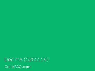Decimal 5265159 Color is a normal green color and the nearest color is GO Green #00ab66. Hex code #07b76b and RGB value is rgb(7,183,107). In RGB color space, this color is composed of 3% red, 72% green, 42% blue, In CMYK color space, this color is composed of 96% cyan, 0% magenta, 42% yellow , 28% black , In HSL color space, this color has a hue angle of 154° , 93% saturation and 37% lightness.