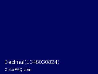 Decimal 1348030824 Color is a very dark blue color and the nearest color is Arapawa #110c6c. Hex code #040560 and RGB value is rgb(4,5,96). In RGB color space, this color is composed of 2% red, 2% green, 38% blue, In CMYK color space, this color is composed of 96% cyan, 95% magenta, 0% yellow , 62% black , In HSL color space, this color has a hue angle of 239° , 92% saturation and 20% lightness.