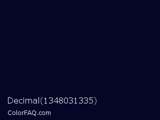 Decimal 1348031335 Color is a almost black blue color and the nearest color is Deep Ebony #0c0b1d. Hex code #040627 and RGB value is rgb(4,6,39). In RGB color space, this color is composed of 2% red, 2% green, 15% blue, In CMYK color space, this color is composed of 90% cyan, 85% magenta, 0% yellow , 85% black , In HSL color space, this color has a hue angle of 237° , 81% saturation and 8% lightness.
