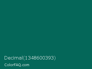 Decimal 1348600393 Color is a very dark cyan color and the nearest color is Watercourse #056f57. Hex code #046759 and RGB value is rgb(4,103,89). In RGB color space, this color is composed of 2% red, 40% green, 35% blue, In CMYK color space, this color is composed of 96% cyan, 0% magenta, 14% yellow , 60% black , In HSL color space, this color has a hue angle of 172° , 93% saturation and 21% lightness.