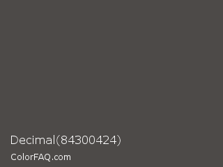 Decimal 84300424 Color is a dark orange color and the nearest color is Emperor #514649. Hex code #4d4a48 and RGB value is rgb(77,74,72). In RGB color space, this color is composed of 30% red, 29% green, 28% blue, In CMYK color space, this color is composed of 0% cyan, 4% magenta, 6% yellow , 70% black , In HSL color space, this color has a hue angle of 24° , 3% saturation and 29% lightness.