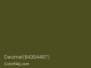 Decimal 84304497 Color is a very dark yellow color and the nearest color is Army Green #4b5320. Hex code #4d4e1f and RGB value is rgb(77,78,31). In RGB color space, this color is composed of 30% red, 31% green, 12% blue, In CMYK color space, this color is composed of 1% cyan, 0% magenta, 60% yellow , 69% black , In HSL color space, this color has a hue angle of 61° , 43% saturation and 21% lightness.
