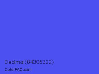 Decimal 84306322 Color is a light blue color and the nearest color is Ultramarine Blue #4166f5. Hex code #4d50f0 and RGB value is rgb(77,80,240). In RGB color space, this color is composed of 30% red, 31% green, 94% blue, In CMYK color space, this color is composed of 68% cyan, 67% magenta, 0% yellow , 6% black , In HSL color space, this color has a hue angle of 239° , 84% saturation and 62% lightness.