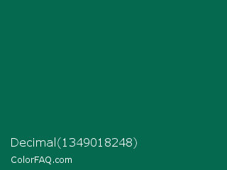 Decimal 1349018248 Color is a very dark cyan color and the nearest color is Bottle Green #006a4e. Hex code #056950 and RGB value is rgb(5,105,80). In RGB color space, this color is composed of 2% red, 41% green, 31% blue, In CMYK color space, this color is composed of 95% cyan, 0% magenta, 24% yellow , 59% black , In HSL color space, this color has a hue angle of 165° , 91% saturation and 22% lightness.