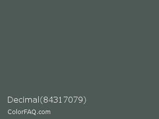 Decimal 84317079 Color is a normal green color and the nearest color is Feldgrau #4d5d53. Hex code #4d5a55 and RGB value is rgb(77,90,85). In RGB color space, this color is composed of 30% red, 35% green, 33% blue, In CMYK color space, this color is composed of 14% cyan, 0% magenta, 6% yellow , 65% black , In HSL color space, this color has a hue angle of 157° , 8% saturation and 33% lightness.