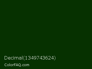 Decimal 1349743624 Color is a very dark green color and the nearest color is Deep Fir #002900. Hex code #063100 and RGB value is rgb(6,49,0). In RGB color space, this color is composed of 2% red, 19% green, 0% blue, In CMYK color space, this color is composed of 88% cyan, 0% magenta, 100% yellow , 81% black , In HSL color space, this color has a hue angle of 113° , 100% saturation and 10% lightness.