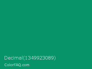 Decimal 1349923089 Color is a dark green color and the nearest color is Green Cyan #009966. Hex code #069567 and RGB value is rgb(6,149,103). In RGB color space, this color is composed of 2% red, 58% green, 40% blue, In CMYK color space, this color is composed of 96% cyan, 0% magenta, 31% yellow , 42% black , In HSL color space, this color has a hue angle of 161° , 92% saturation and 30% lightness.