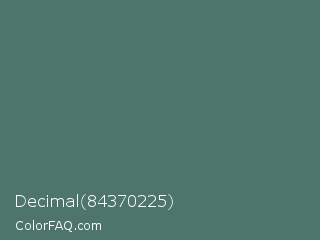 Decimal 84370225 Color is a normal cyan color and the nearest color is Hookers Green #49796b. Hex code #4d756b and RGB value is rgb(77,117,107). In RGB color space, this color is composed of 30% red, 46% green, 42% blue, In CMYK color space, this color is composed of 34% cyan, 0% magenta, 9% yellow , 54% black , In HSL color space, this color has a hue angle of 165° , 21% saturation and 38% lightness.