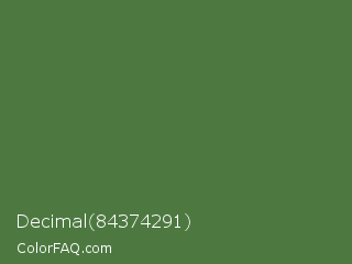 Decimal 84374291 Color is a normal green color and the nearest color is Fern Green #4f7942. Hex code #4d7941 and RGB value is rgb(77,121,65). In RGB color space, this color is composed of 30% red, 47% green, 25% blue, In CMYK color space, this color is composed of 36% cyan, 0% magenta, 46% yellow , 53% black , In HSL color space, this color has a hue angle of 107° , 30% saturation and 36% lightness.