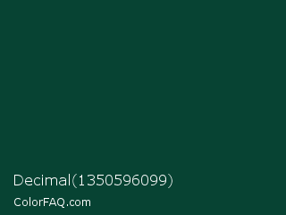 Decimal 1350596099 Color is a very dark cyan color and the nearest color is Sherwood Green #02402c. Hex code #074333 and RGB value is rgb(7,67,51). In RGB color space, this color is composed of 3% red, 26% green, 20% blue, In CMYK color space, this color is composed of 90% cyan, 0% magenta, 24% yellow , 74% black , In HSL color space, this color has a hue angle of 164° , 81% saturation and 15% lightness.