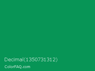 Decimal 1350731312 Color is a normal green color and the nearest color is Spanish Green #009150. Hex code #079556 and RGB value is rgb(7,149,86). In RGB color space, this color is composed of 3% red, 58% green, 34% blue, In CMYK color space, this color is composed of 95% cyan, 0% magenta, 42% yellow , 42% black , In HSL color space, this color has a hue angle of 153° , 91% saturation and 31% lightness.