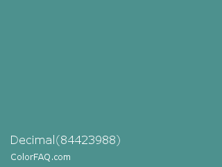 Decimal 84423988 Color is a normal cyan color and the nearest color is Smalt Blue #51808f. Hex code #4d918e and RGB value is rgb(77,145,142). In RGB color space, this color is composed of 30% red, 57% green, 56% blue, In CMYK color space, this color is composed of 47% cyan, 0% magenta, 2% yellow , 43% black , In HSL color space, this color has a hue angle of 177° , 31% saturation and 44% lightness.