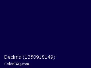 Decimal 1350918149 Color is a very dark indigo color and the nearest color is Stratos #000741. Hex code #080045 and RGB value is rgb(8,0,69). In RGB color space, this color is composed of 3% red, 0% green, 27% blue, In CMYK color space, this color is composed of 88% cyan, 100% magenta, 0% yellow , 73% black , In HSL color space, this color has a hue angle of 247° , 100% saturation and 14% lightness.