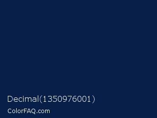 Decimal 1350976001 Color is a very dark blue color and the nearest color is Oxford Blue #002147. Hex code #082049 and RGB value is rgb(8,32,73). In RGB color space, this color is composed of 3% red, 13% green, 29% blue, In CMYK color space, this color is composed of 89% cyan, 56% magenta, 0% yellow , 71% black , In HSL color space, this color has a hue angle of 218° , 80% saturation and 16% lightness.