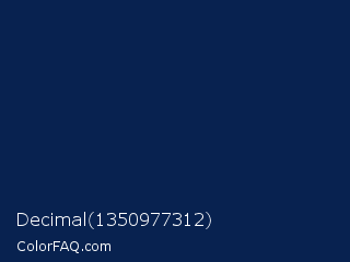 Decimal 1350977312 Color is a very dark blue color and the nearest color is Downriver #092256. Hex code #082250 and RGB value is rgb(8,34,80). In RGB color space, this color is composed of 3% red, 13% green, 31% blue, In CMYK color space, this color is composed of 90% cyan, 58% magenta, 0% yellow , 69% black , In HSL color space, this color has a hue angle of 218° , 82% saturation and 17% lightness.
