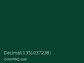 Decimal 1351037238 Color is a very dark green color and the nearest color is Sherwood Green #02402c. Hex code #084330 and RGB value is rgb(8,67,48). In RGB color space, this color is composed of 3% red, 26% green, 19% blue, In CMYK color space, this color is composed of 88% cyan, 0% magenta, 28% yellow , 74% black , In HSL color space, this color has a hue angle of 161° , 79% saturation and 15% lightness.