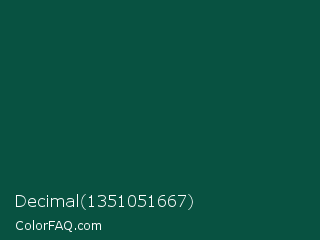 Decimal 1351051667 Color is a very dark cyan color and the nearest color is Evening Sea #024e46. Hex code #085241 and RGB value is rgb(8,82,65). In RGB color space, this color is composed of 3% red, 32% green, 25% blue, In CMYK color space, this color is composed of 90% cyan, 0% magenta, 21% yellow , 68% black , In HSL color space, this color has a hue angle of 166° , 82% saturation and 18% lightness.