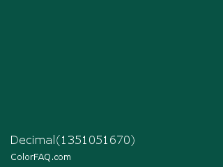 Decimal 1351051670 Color is a very dark cyan color and the nearest color is Evening Sea #024e46. Hex code #085244 and RGB value is rgb(8,82,68). In RGB color space, this color is composed of 3% red, 32% green, 27% blue, In CMYK color space, this color is composed of 90% cyan, 0% magenta, 17% yellow , 68% black , In HSL color space, this color has a hue angle of 169° , 82% saturation and 18% lightness.