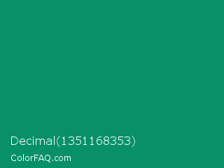 Decimal 1351168353 Color is a dark green color and the nearest color is Green Cyan #009966. Hex code #089169 and RGB value is rgb(8,145,105). In RGB color space, this color is composed of 3% red, 57% green, 41% blue, In CMYK color space, this color is composed of 94% cyan, 0% magenta, 28% yellow , 43% black , In HSL color space, this color has a hue angle of 162° , 90% saturation and 30% lightness.