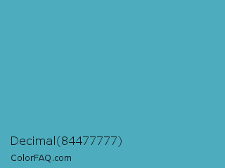 Decimal 84477777 Color is a normal cyan color and the nearest color is Fountain Blue #56b4be. Hex code #4dadbf and RGB value is rgb(77,173,191). In RGB color space, this color is composed of 30% red, 68% green, 75% blue, In CMYK color space, this color is composed of 60% cyan, 9% magenta, 0% yellow , 25% black , In HSL color space, this color has a hue angle of 189° , 47% saturation and 53% lightness.