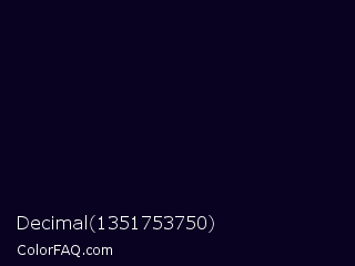 Decimal 1351753750 Color is a almost black indigo color and the nearest color is Black Russian #0a001c. Hex code #090220 and RGB value is rgb(9,2,32). In RGB color space, this color is composed of 4% red, 1% green, 13% blue, In CMYK color space, this color is composed of 72% cyan, 94% magenta, 0% yellow , 87% black , In HSL color space, this color has a hue angle of 254° , 88% saturation and 7% lightness.