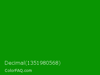 Decimal 1351980568 Color is a dark green color and the nearest color is Islamic Green #009000. Hex code #099502 and RGB value is rgb(9,149,2). In RGB color space, this color is composed of 4% red, 58% green, 1% blue, In CMYK color space, this color is composed of 94% cyan, 0% magenta, 99% yellow , 42% black , In HSL color space, this color has a hue angle of 117° , 97% saturation and 30% lightness.