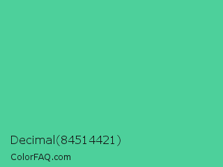 Decimal 84514421 Color is a normal green color and the nearest color is Eucalyptus #44d7a8. Hex code #4dd09b and RGB value is rgb(77,208,155). In RGB color space, this color is composed of 30% red, 82% green, 61% blue, In CMYK color space, this color is composed of 63% cyan, 0% magenta, 25% yellow , 18% black , In HSL color space, this color has a hue angle of 156° , 58% saturation and 56% lightness.