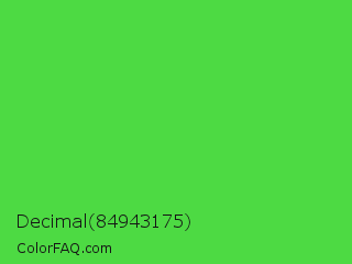 Decimal 84943175 Color is a normal green color and the nearest color is Lime Green #32cd32. Hex code #4dda43 and RGB value is rgb(77,218,67). In RGB color space, this color is composed of 30% red, 85% green, 26% blue, In CMYK color space, this color is composed of 65% cyan, 0% magenta, 69% yellow , 15% black , In HSL color space, this color has a hue angle of 116° , 67% saturation and 56% lightness.
