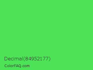 Decimal 84952177 Color is a normal green color and the nearest color is UFO Green #3cd070. Hex code #4de357 and RGB value is rgb(77,227,87). In RGB color space, this color is composed of 30% red, 89% green, 34% blue, In CMYK color space, this color is composed of 66% cyan, 0% magenta, 62% yellow , 11% black , In HSL color space, this color has a hue angle of 124° , 73% saturation and 60% lightness.
