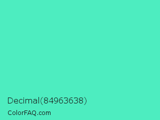 Decimal 84963638 Color is a light green color and the nearest color is Turquoise #40e0d0. Hex code #4dedc0 and RGB value is rgb(77,237,192). In RGB color space, this color is composed of 30% red, 93% green, 75% blue, In CMYK color space, this color is composed of 68% cyan, 0% magenta, 19% yellow , 7% black , In HSL color space, this color has a hue angle of 163° , 82% saturation and 62% lightness.