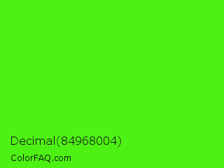 Decimal 84968004 Color is a normal green color and the nearest color is Neon Green #39ff14. Hex code #4df214 and RGB value is rgb(77,242,20). In RGB color space, this color is composed of 30% red, 95% green, 8% blue, In CMYK color space, this color is composed of 68% cyan, 0% magenta, 92% yellow , 5% black , In HSL color space, this color has a hue angle of 105° , 90% saturation and 51% lightness.