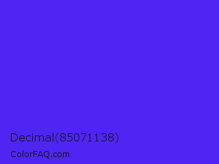 Decimal 85071138 Color is a normal indigo color and the nearest color is Han Purple #5218fa. Hex code #4e25f2 and RGB value is rgb(78,37,242). In RGB color space, this color is composed of 31% red, 15% green, 95% blue, In CMYK color space, this color is composed of 68% cyan, 85% magenta, 0% yellow , 5% black , In HSL color space, this color has a hue angle of 252° , 89% saturation and 55% lightness.