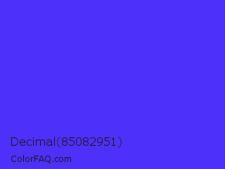 Decimal 85082951 Color is a normal indigo color and the nearest color is Han Purple #5218fa. Hex code #4e30fb and RGB value is rgb(78,48,251). In RGB color space, this color is composed of 31% red, 19% green, 98% blue, In CMYK color space, this color is composed of 69% cyan, 81% magenta, 0% yellow , 2% black , In HSL color space, this color has a hue angle of 249° , 96% saturation and 59% lightness.