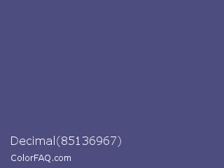 Decimal 85136967 Color is a normal indigo color and the nearest color is Purple Navy #4e5180. Hex code #4e4d7f and RGB value is rgb(78,77,127). In RGB color space, this color is composed of 31% red, 30% green, 50% blue, In CMYK color space, this color is composed of 39% cyan, 39% magenta, 0% yellow , 50% black , In HSL color space, this color has a hue angle of 241° , 25% saturation and 40% lightness.