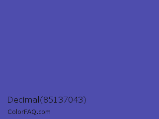 Decimal 85137043 Color is a normal indigo color and the nearest color is Ocean Blue #4f42b5. Hex code #4e4dad and RGB value is rgb(78,77,173). In RGB color space, this color is composed of 31% red, 30% green, 68% blue, In CMYK color space, this color is composed of 55% cyan, 55% magenta, 0% yellow , 32% black , In HSL color space, this color has a hue angle of 241° , 38% saturation and 49% lightness.