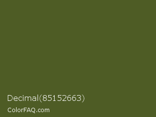 Decimal 85152663 Color is a dark lime color and the nearest color is Dark Moss Green #4a5d23. Hex code #4e5c25 and RGB value is rgb(78,92,37). In RGB color space, this color is composed of 31% red, 36% green, 15% blue, In CMYK color space, this color is composed of 15% cyan, 0% magenta, 60% yellow , 64% black , In HSL color space, this color has a hue angle of 75° , 43% saturation and 25% lightness.