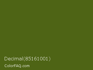 Decimal 85161001 Color is a dark lime color and the nearest color is Saratoga #555b10. Hex code #4e6415 and RGB value is rgb(78,100,21). In RGB color space, this color is composed of 31% red, 39% green, 8% blue, In CMYK color space, this color is composed of 22% cyan, 0% magenta, 79% yellow , 61% black , In HSL color space, this color has a hue angle of 77° , 65% saturation and 24% lightness.